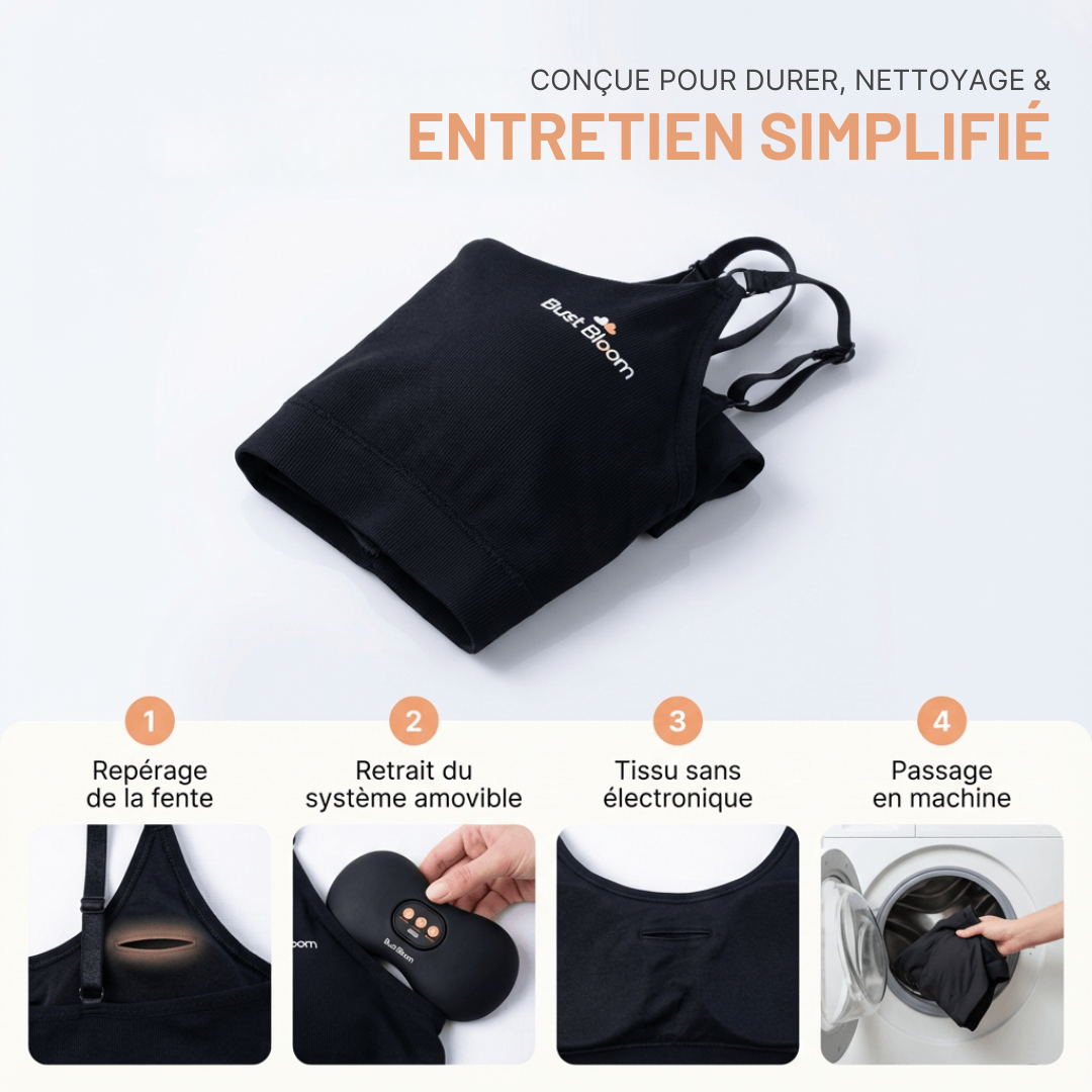 La brassière Bust Bloom utilise une technologie exclusive appelée BioLift, basée sur une combinaison précise de massage tridimensionnel et de chaleur douce ciblée. Grâce à des micro-moteurs intelligents placés stratégiquement, cette technologie stimule en douceur les tissus mammaires en favorisant la circulation sanguine et le drainage lymphatique.
